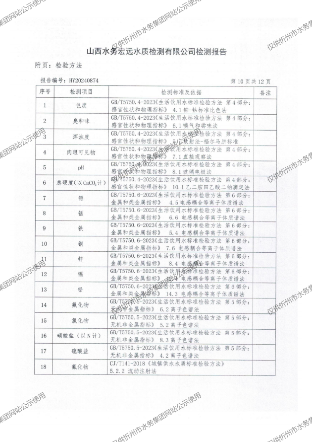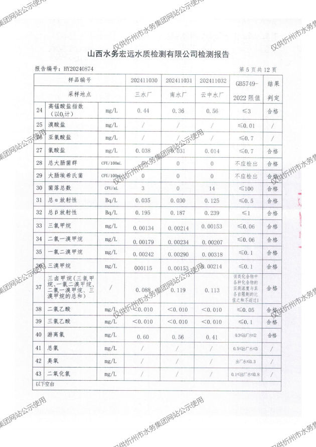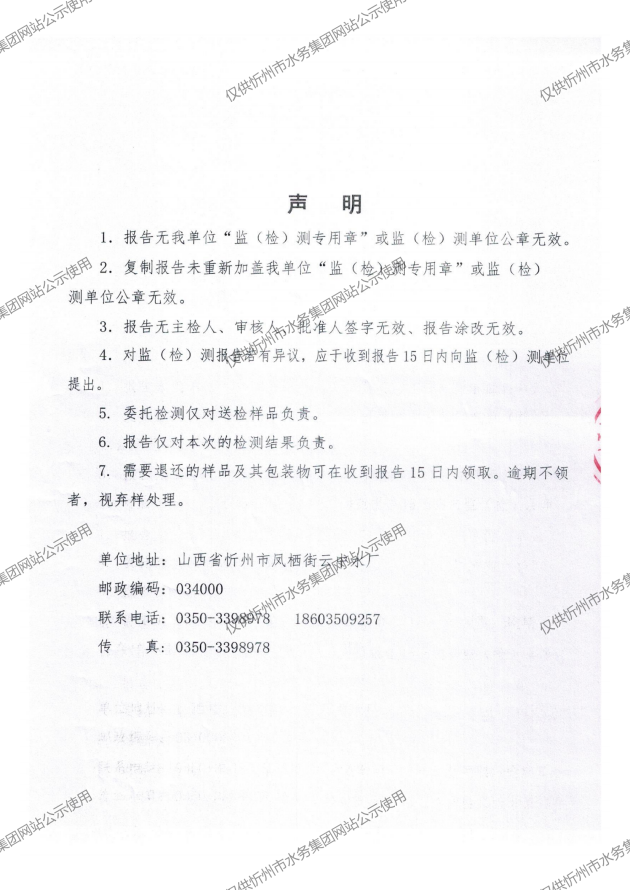 忻州城區(qū)公共供水水源水、出廠水、管網水、管網末梢水2024年11月份水質信息公示