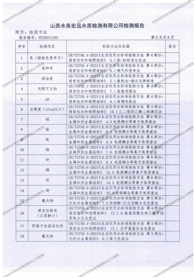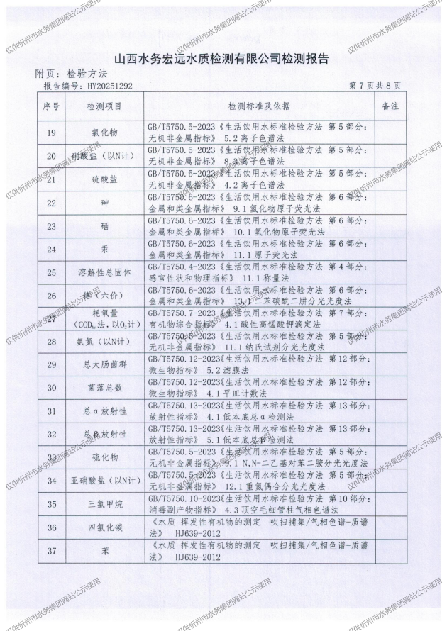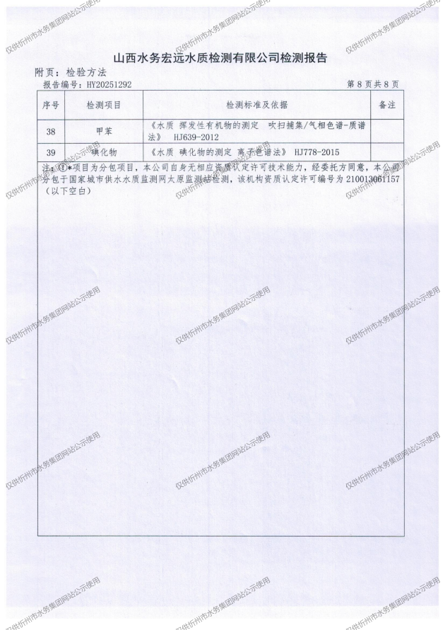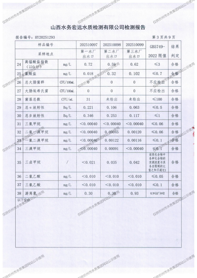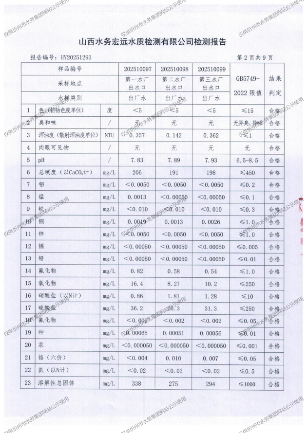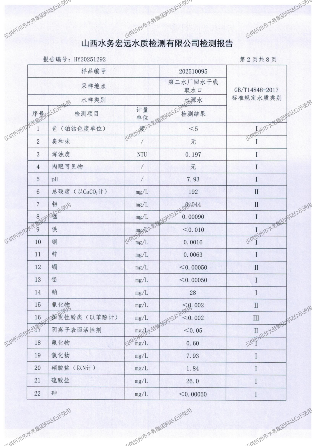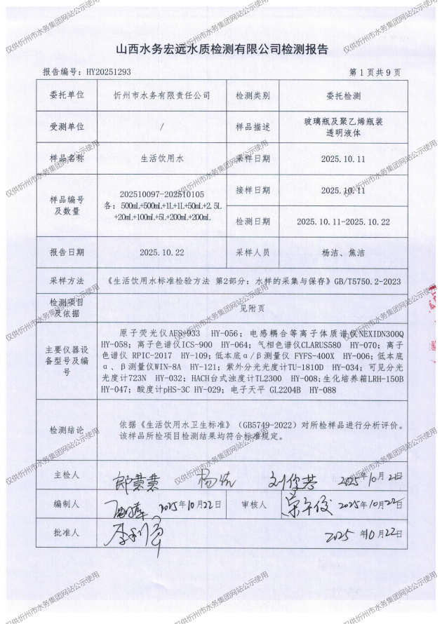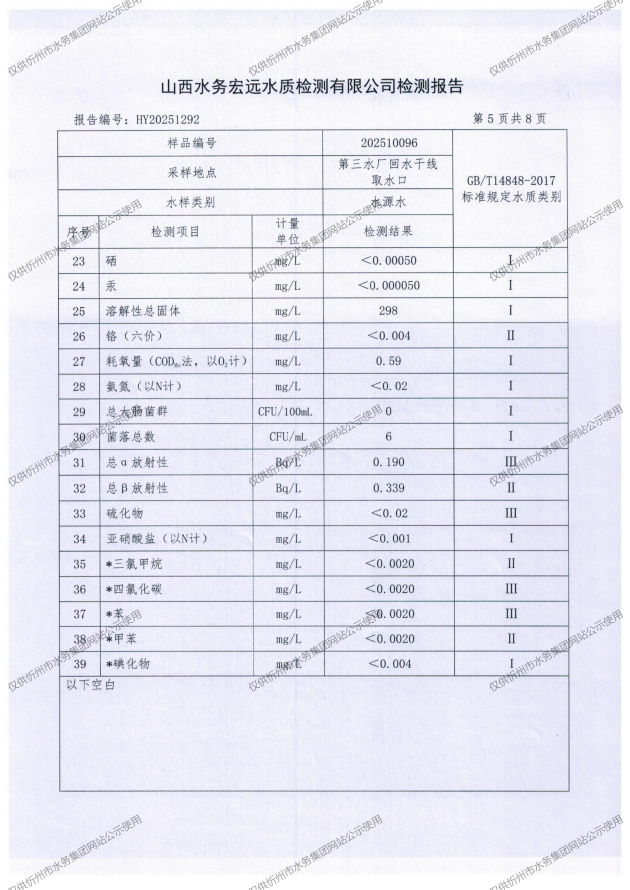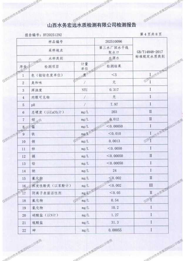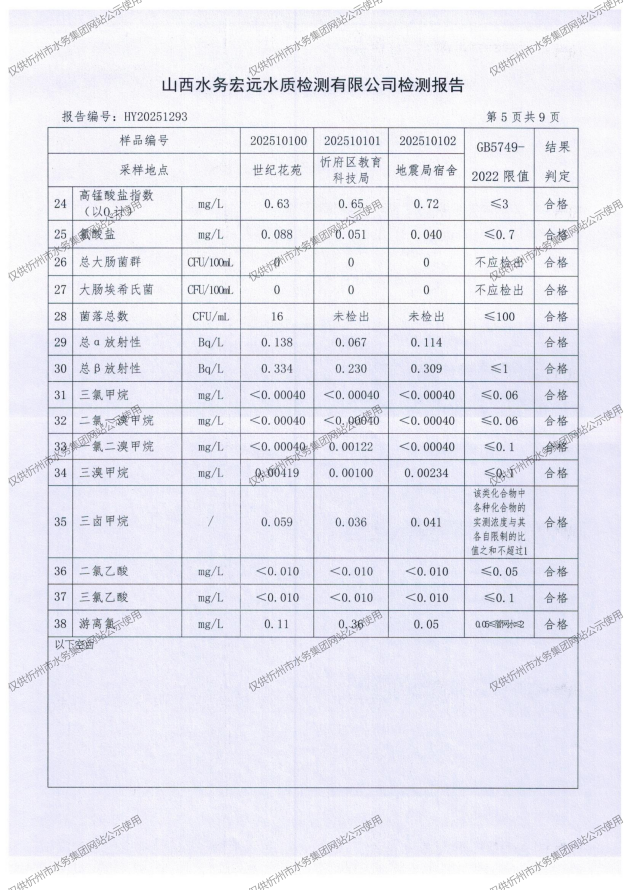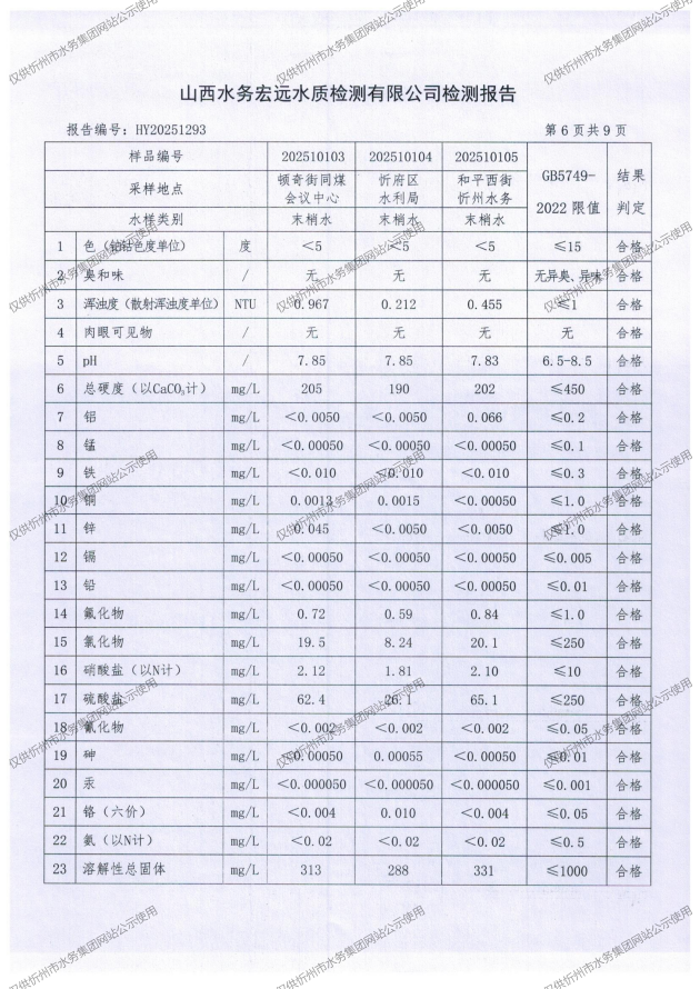 忻州城區(qū)公共供水水源水、出廠水、管網水、管網末梢水2025年10月份水質信息公示