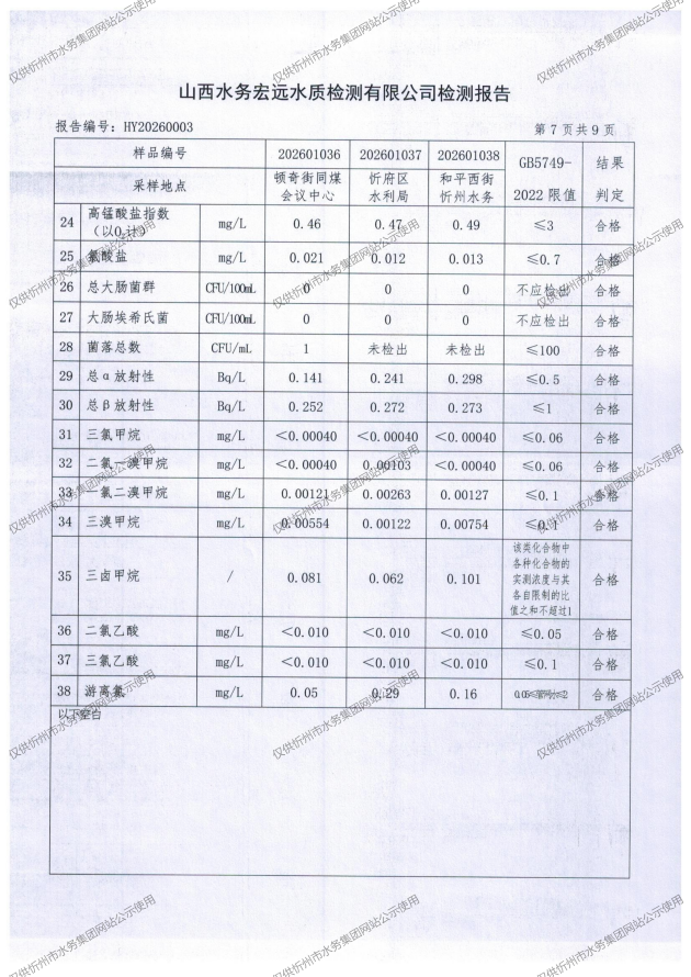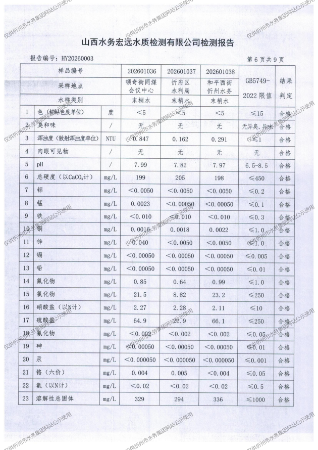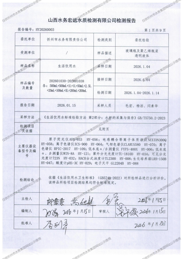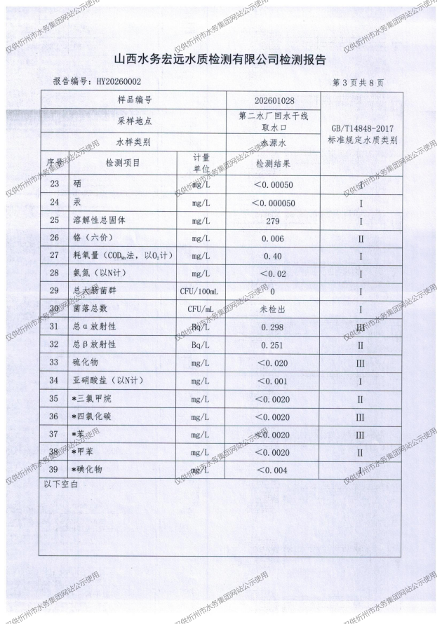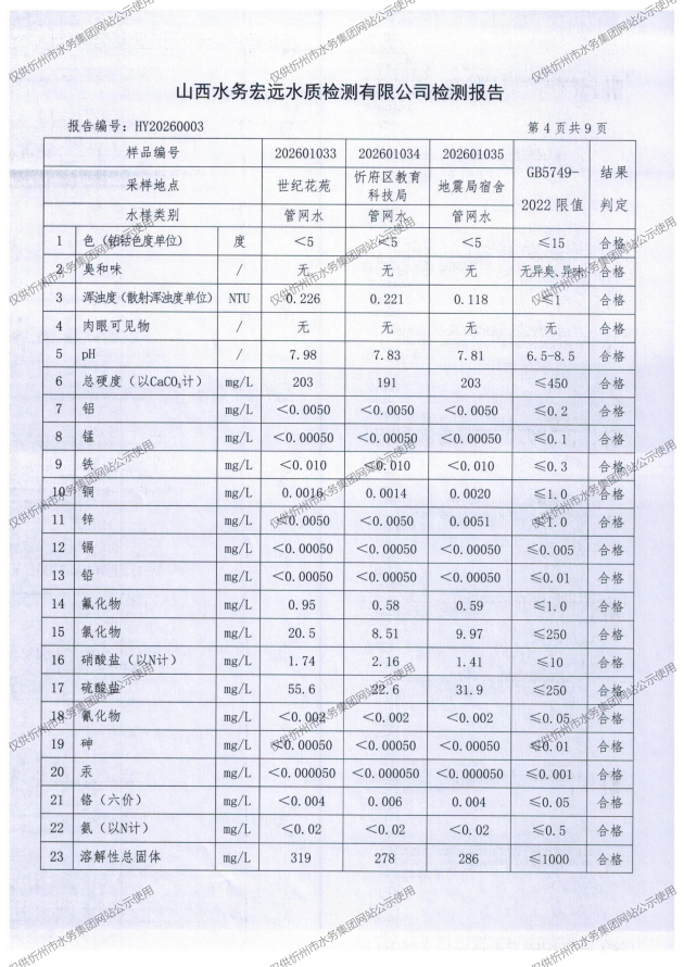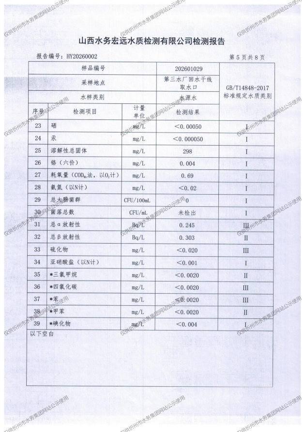 忻州城區(qū)公共供水水源水、出廠水、管網水、管網末梢水2026年1月份水質信息公示