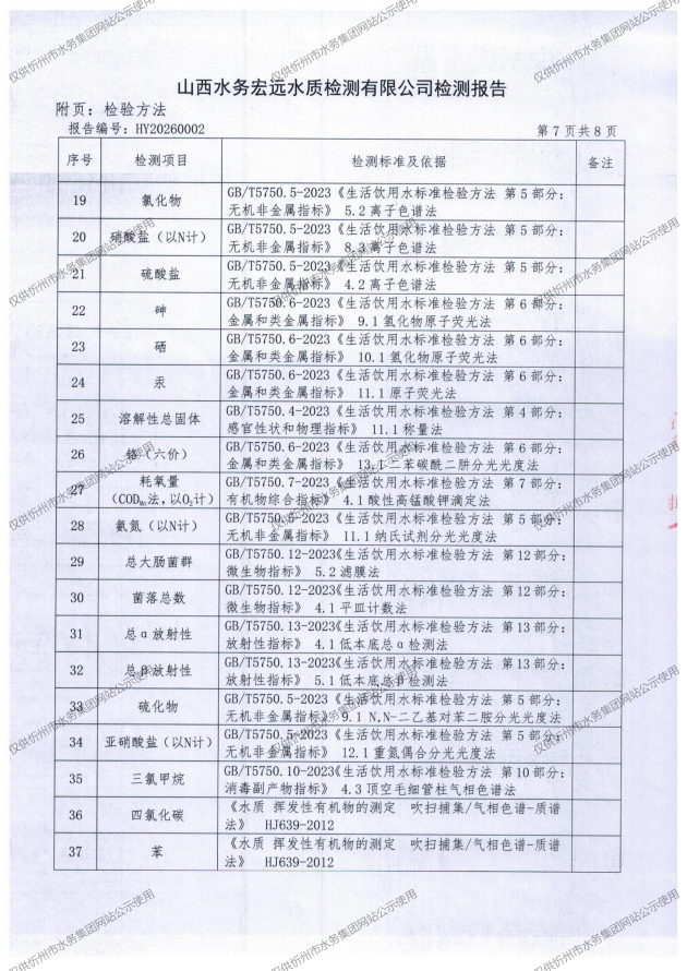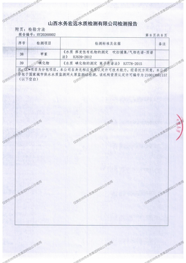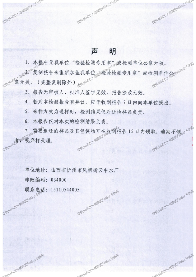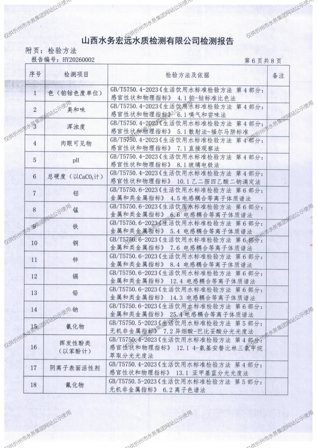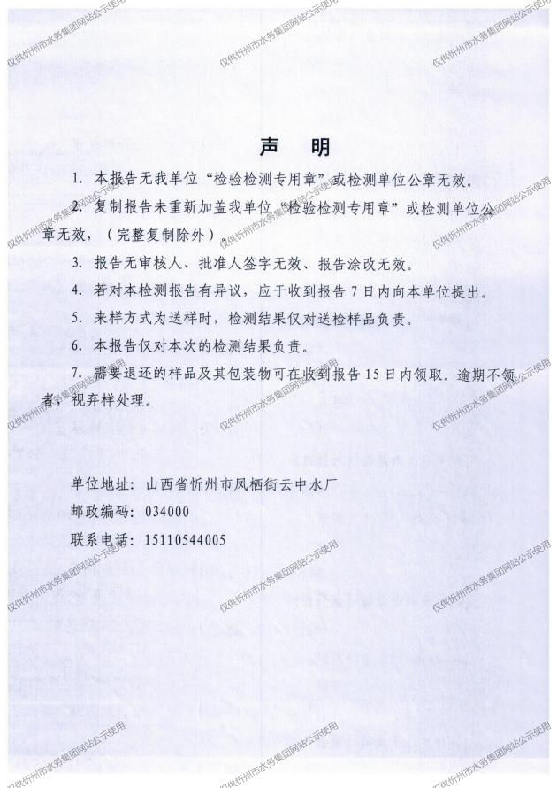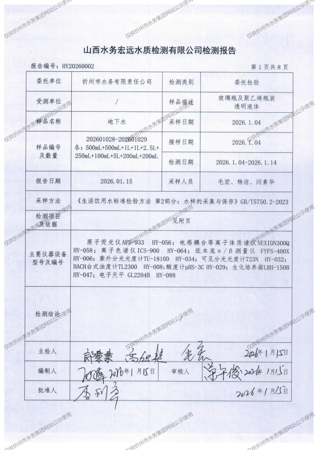 忻州城區(qū)公共供水水源水、出廠水、管網水、管網末梢水2026年1月份水質信息公示