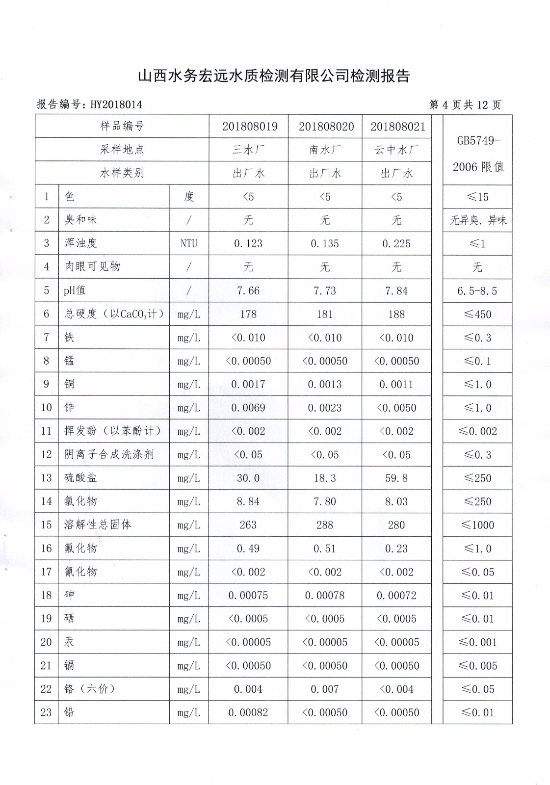 忻州城區(qū)公共供水水源水、出廠水、管網(wǎng)水、管網(wǎng)末梢水2018年8月份水質(zhì)信息公示