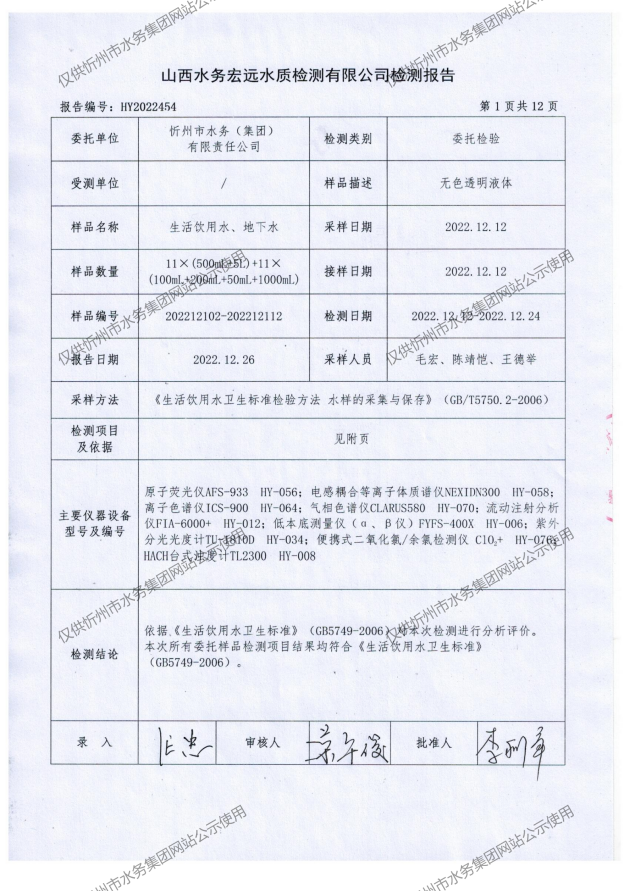 忻州城區(qū)公共供水水源水、出廠水、管網(wǎng)水、管網(wǎng)末梢水2022年12月份水質信息公示