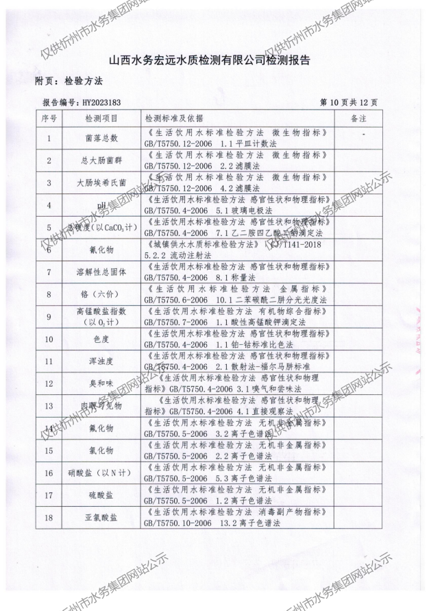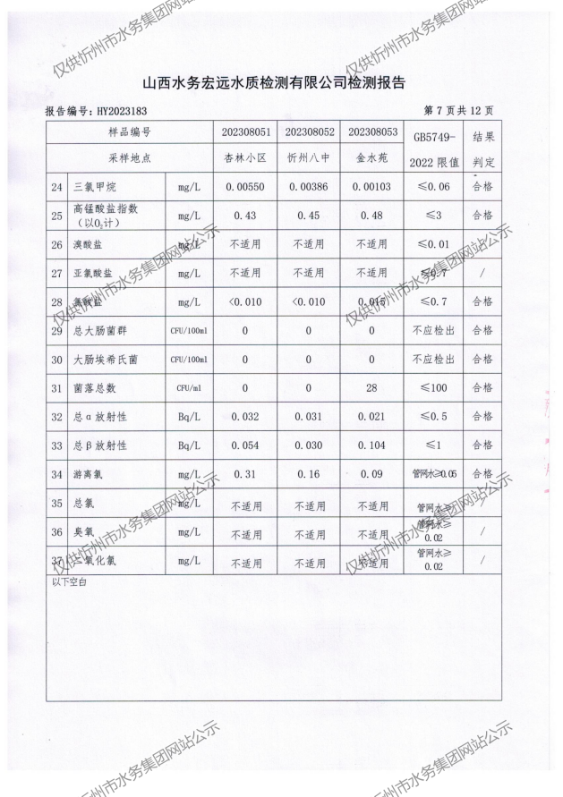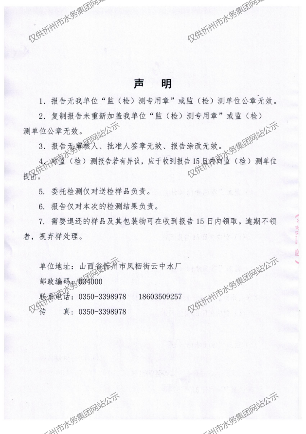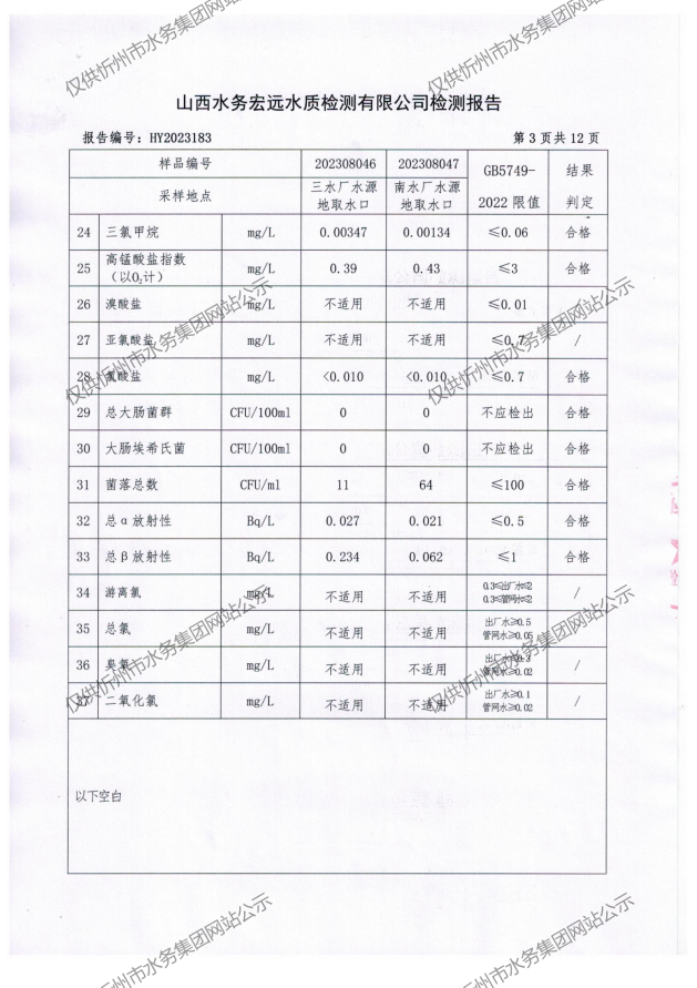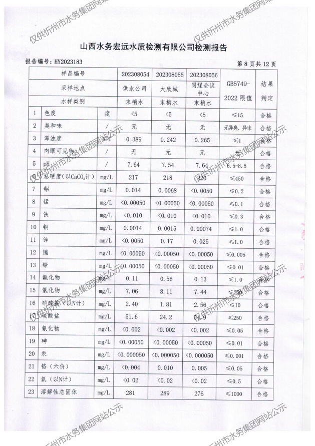 忻州城區(qū)公共供水水源水、出廠水、管網(wǎng)水、管網(wǎng)末梢水2023年8月份水質(zhì)信息公示